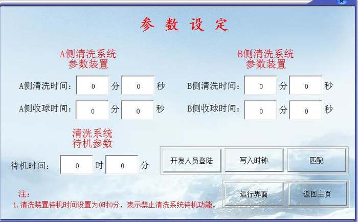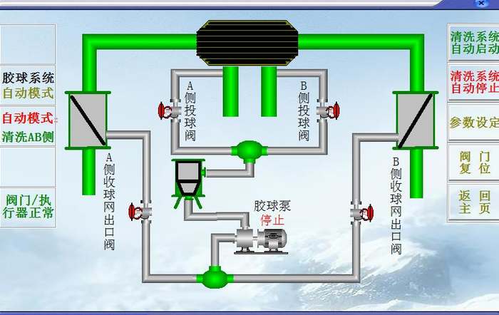 如要實(shí)現AB側清洗按照上述流程即可;若只要實(shí)現A側系統清洗,只需依次操作步驟③④⑤⑥⑦⑧;同理,只要實(shí)現B側系統清洗,只需依次操作步驟⑨⑩⑪⑫⑬⑭。 ⑴將控制柜面板上的“手動(dòng)/自動(dòng)/遠程”旋鈕旋至自動(dòng)檔上,圖1所示的主頁(yè)界面中“就地自動(dòng)模式”指示燈變?yōu)榫G色,表示系統進(jìn)入自動(dòng)模式。 ⑵系統上電后進(jìn)入自動(dòng)模式時(shí),為滿(mǎn)足客戶(hù)多功能需求,本產(chǎn)品設計有三種自動(dòng)模式,分別為“A側清洗”、“B側清洗”、“AB側清洗”。在控制柜面板上可通過(guò)三檔旋鈕進(jìn)行選擇,例將旋鈕旋至 “A側自動(dòng)”,在圖一所示頁(yè)面中“A側自動(dòng)模式”燈亮,表示當前選擇膠球清洗A側,當前模式選擇為“A側清洗”。(注:系統正在運行過(guò)程中,不可切換自動(dòng)運行模式) ⑶自動(dòng)啟動(dòng):用戶(hù)確認所有執行器均可正常運行后,完成相關(guān)參數設定后可將系統投入自動(dòng)運行,例選擇“A側清洗”自動(dòng)模式后,按下圖3運行界面中的“清洗系統自動(dòng)啟動(dòng)”按鈕,系統開(kāi)始自動(dòng)執行手動(dòng)操作中所述的③④⑤⑥⑦⑧步驟;選擇“B側清洗”自動(dòng)模式,按下運行界面中的“清洗系統自動(dòng)啟動(dòng)”按鈕,系統開(kāi)始自動(dòng)執行手動(dòng)操作中所述的⑨⑩⑪⑫⑬⑭步驟; 選擇“AB側清洗”自動(dòng)模式,按下運行界面中的“清洗系統自動(dòng)啟動(dòng)”按鈕,系統開(kāi)始自動(dòng)執行手動(dòng)操作步驟中所述的③④⑤⑥⑦⑧⑨⑩⑪⑫⑬⑭。 自動(dòng)停止:用戶(hù)如需停止系統,按下運行界面中的“系統停止”按鈕,系統停止,閥門(mén)全部關(guān)閉,當所有閥門(mén)關(guān)到位后才可以進(jìn)行下一周期的自動(dòng)運行。 ⑷系統待機:當系統執行完所有的自動(dòng)流程后,開(kāi)始進(jìn)行待機,即系統定時(shí)一段時(shí)間后(清洗系統待機時(shí)間),自動(dòng)開(kāi)始下一個(gè)周期的運行。若用戶(hù)將清洗系統待機時(shí)間設定為0時(shí)0分,表示系統禁止待機功能。此時(shí),系統自動(dòng)運行結束后將停機,只有用戶(hù)再次按下自動(dòng)啟動(dòng)按鈕后,系統才開(kāi)始自動(dòng)運行。 5)遠程操作: 將控制柜面板上的“手動(dòng)/自動(dòng)/遠程”旋鈕旋至遠程檔,系統將進(jìn)入遠程自動(dòng)。在遠程模式下,當系統接收到“遠程啟動(dòng)”或“遠程停止”信號后,清洗系統會(huì )根據客戶(hù)所選模式自動(dòng)執行相應的步驟。