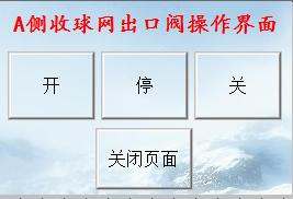 關(guān)閉裝球室:在圖9所示的裝球室操作窗口中輕按收球按鈕,裝球室將關(guān)閉收球,直至運行至關(guān)到位的位置后,系統自動(dòng)斷電,裝球室切換閥停止。維持此時(shí)系統狀態(tài)一段時(shí)間,收球A側。 ⑦關(guān)閉A側投球閥,停止膠球泵: 輕按圖3所示運行界面中A側收球網(wǎng)出口閥圖標,彈出如圖7所示的操作窗口,輕按“關(guān)”按鈕,A側投球閥關(guān)閉,直至閥門(mén)運行至全關(guān)位置,系統自動(dòng)斷電,閥門(mén)停止; 在“運行界面”中輕按膠球泵圖標,彈出圖8示的操作窗口。輕按“停止”按鈕,膠球泵停止運行,首次使用時(shí)應注意電機是否為順時(shí)針旋轉,若不是,則電機反向,斷電后將電機三相電源線(xiàn)中的任意兩相調換位置即可。 ⑧關(guān)閉A側收球網(wǎng)出口閥:輕按圖3所示運行界面中的“A側收球網(wǎng)出口閥”圖標,彈出如圖6所示的操作窗口,輕按“關(guān)”按鈕,A側收球網(wǎng)出口閥關(guān)閉,直至閥門(mén)運行至全關(guān)位置,系統自動(dòng)斷電,閥門(mén)停止。 ⑨關(guān)閉分匯器:分別輕按圖3所示運行界面中的下方“分匯器”圖標,彈出如圖4所示的操作窗口,輕按“B側運行”按鈕,分匯器關(guān)閉,直至閥門(mén)運行至全關(guān)位置,系統自動(dòng)斷電,閥門(mén)停止; 分別輕按圖3所示運行界面中的上方“分匯器”圖標,彈出如圖5所示的操作窗口,輕按“B側運行”按鈕,分匯器關(guān)閉,直至閥門(mén)運行至全關(guān)位置,系統自動(dòng)斷電,閥門(mén)停止;