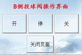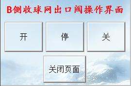 ⑪啟動(dòng)膠球泵:在“運行界面”中輕按膠球泵圖標,彈出圖8示的操作窗口。輕按“啟動(dòng)”按鈕,膠球泵開(kāi)始運行,首次使用時(shí)應注意電機是否為順時(shí)針旋轉,若不是,則電機反向,斷電后將電機三相電源線(xiàn)中的任意兩相調換位置即可。 ⑫打開(kāi)裝球室:在圖9所示的裝球室操作窗口中輕按“投球”按鈕,裝球室將打開(kāi)投球,直至運行至開(kāi)到位的位置后,系統自動(dòng)斷電,裝球室切換閥停止。維持此時(shí)系統狀態(tài)一段時(shí)間,清洗B側。 關(guān)閉裝球室:在圖9所示的裝球室操作窗口中輕按“收球”按鈕,裝球室將關(guān)閉收球,直至運行至關(guān)到位的位置后,系統自動(dòng)斷電,裝球室切換閥停止。維持此時(shí)系統狀態(tài)一段時(shí)間,收球B側。 ⑬關(guān)閉B側投球閥,停止膠球泵:在圖9所示的B側投球閥操作窗口中輕按“關(guān)閉”按鈕,閥門(mén)將關(guān)閉,直至運行至全關(guān)位置,系統自動(dòng)斷電,閥門(mén)停止。 停止膠球泵:在圖8所示的膠球泵操作窗口中輕按“停止”按鈕,膠球泵將停止 ⑭關(guān)閉B側收球網(wǎng)出口閥:輕按圖3所示運行界面中的“B側收球網(wǎng)出口閥”圖標,彈出如圖10所示的操作窗口,輕按“關(guān)”按鈕,B側收球網(wǎng)出口閥關(guān)閉,直至閥門(mén)運行至全關(guān)位置,系統自動(dòng)斷電,閥門(mén)停止。