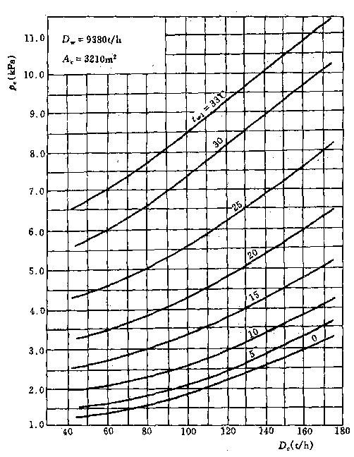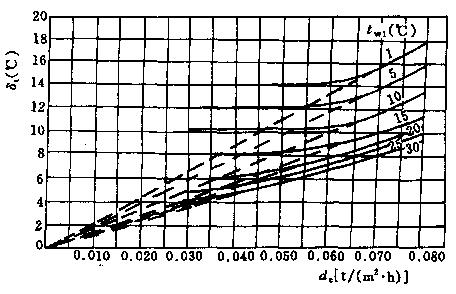 圖4-5端差Δt與Dc、tw1的關(guān)系曲線(xiàn) 在冷凝器的實(shí)際運行中,當工況變化時(shí),K值并不是一個(gè)常數,而是決定于冷凝器內漏人空氣量的大小。當單位熱負荷Dc減 小時(shí),即Dc減小,此時(shí)冷卻水量Dw未變,冷凝器真空將變好,將使漏入的空氣量有所增大,使K值降低 ,Δt值將增大,這就使得冷凝器在低負荷時(shí),Δt不再隨著(zhù)Dc(=Dc/Ac)的減小而減小,而是近似不變或下降緩慢。 此外,當冷卻水進(jìn)水溫度人,愈低,冷凝器膠球清洗裝置真空將相應提高,使K值減小,這時(shí)影響K值的因素除了Dc外,又多了一個(gè)tw1,將使K值更加變小,這將在較高的單位熱負荷下,使Δt值趨于穩定,而且穩定在較高的Δt值下,如 圖4-5所示。